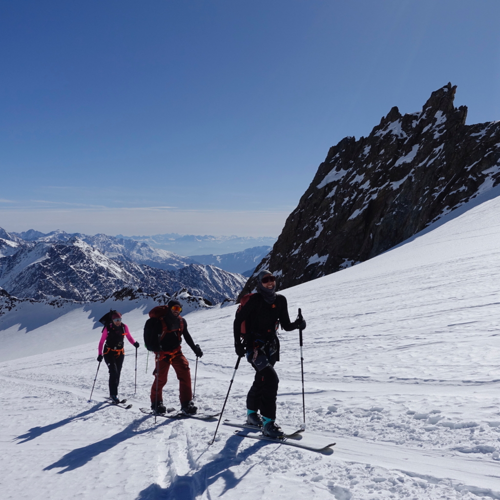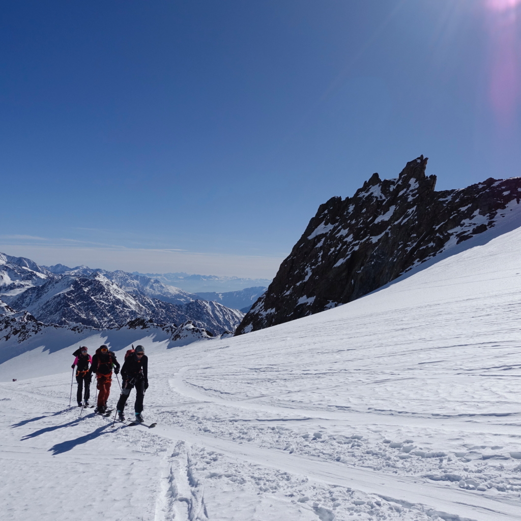 L’itinerario alterna giornate tecniche a tappe più distensive, con dislivelli che variano dai 600 ai 1.200 metri di salita, offrendo un perfetto equilibrio tra impegno fisico e piacere dello sci. Le discese, lunghe e gratificanti, attraversano ghiacciai spettacolari come l’Hintereis e il Kesselwandferner, fino al rientro finale a Vent.