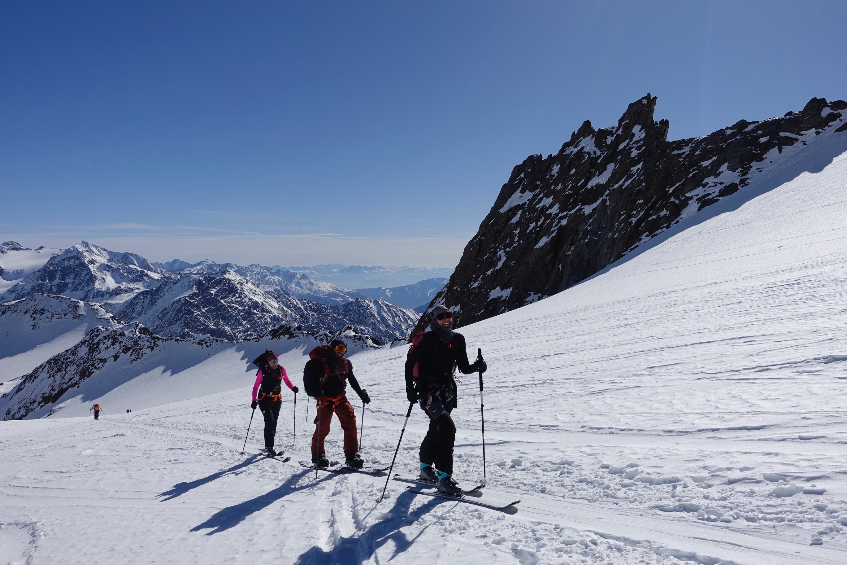 L’itinerario alterna giornate tecniche a tappe più distensive, con dislivelli che variano dai 600 ai 1.200 metri di salita, offrendo un perfetto equilibrio tra impegno fisico e piacere dello sci. Le discese, lunghe e gratificanti, attraversano ghiacciai spettacolari come l’Hintereis e il Kesselwandferner, fino al rientro finale a Vent.